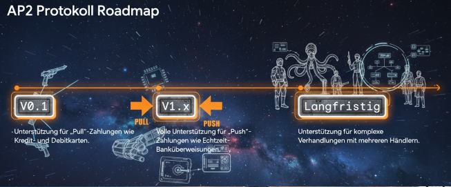 Das Agent Payments Protocol (AP2) ist ein offener Standard, der von Google entwickelt wurde, um autonomen KI-Agenten sichere und verifizierbare Zahlungen zu ermöglichen. In der ersten Phase sind Pull Payments umgesetzt, um die Anwendung im E-Commerce zusammen mit Kreditkartendaten zu ermöglichen. Der Händler erhält die Kreditkartendaten und zieht den Kaufbetrag ein.