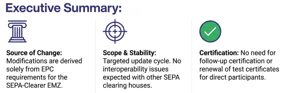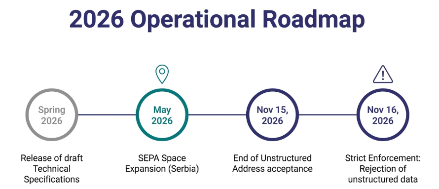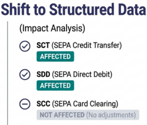 The most significant technical change will come into effect on 16 November 2026: from this business day onwards, unstructured address details for payers and payees will no longer be permitted in payment transactions.Transactions will be checked by the SEPA clearer and, if necessary, rejected with error code XT33. This requirement applies to SEPA credit transfers (SCT) and direct debits (SDD).