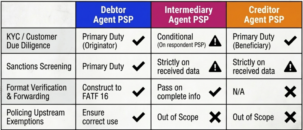 - Must conduct CDD on their direct PSP customers (correspondent relationships), but they are not responsible for performing CDD on the underlying debtors, creditors, or other indirect PSPs.